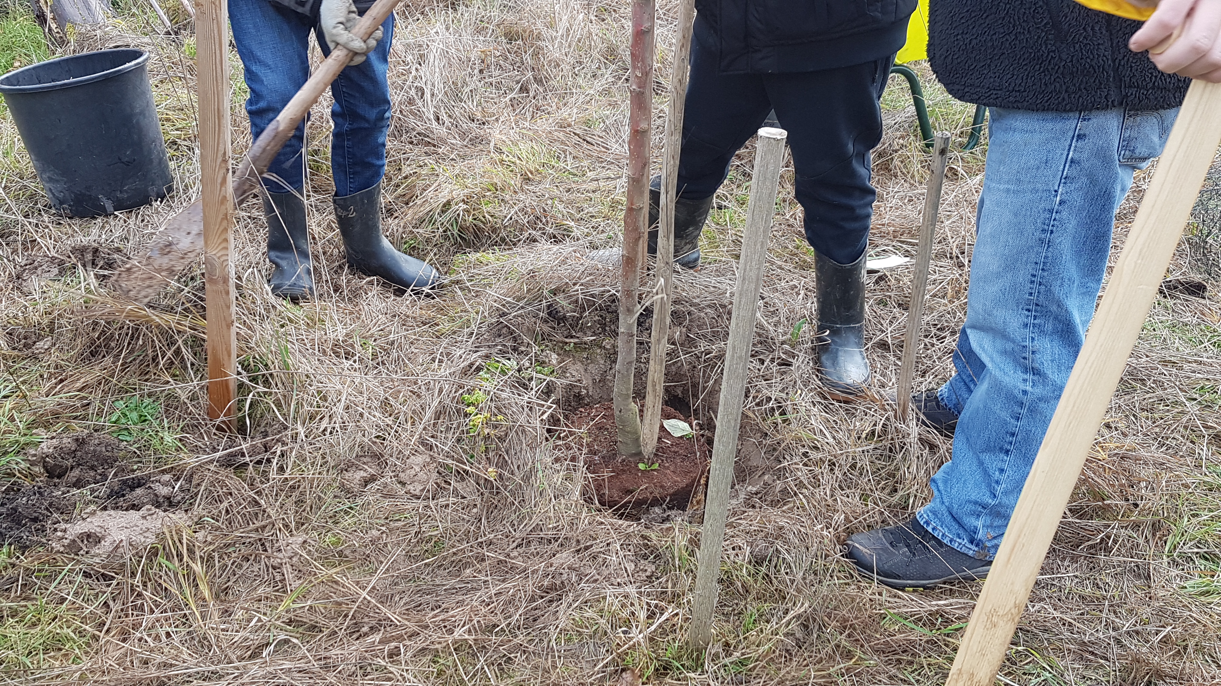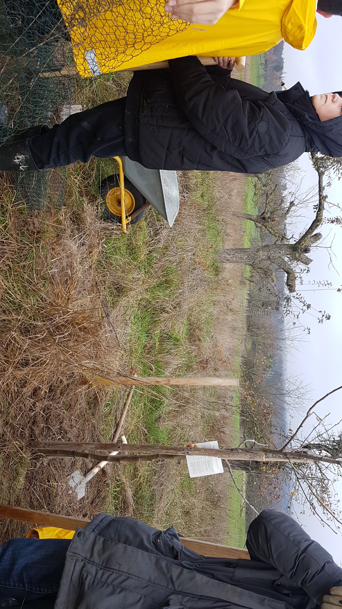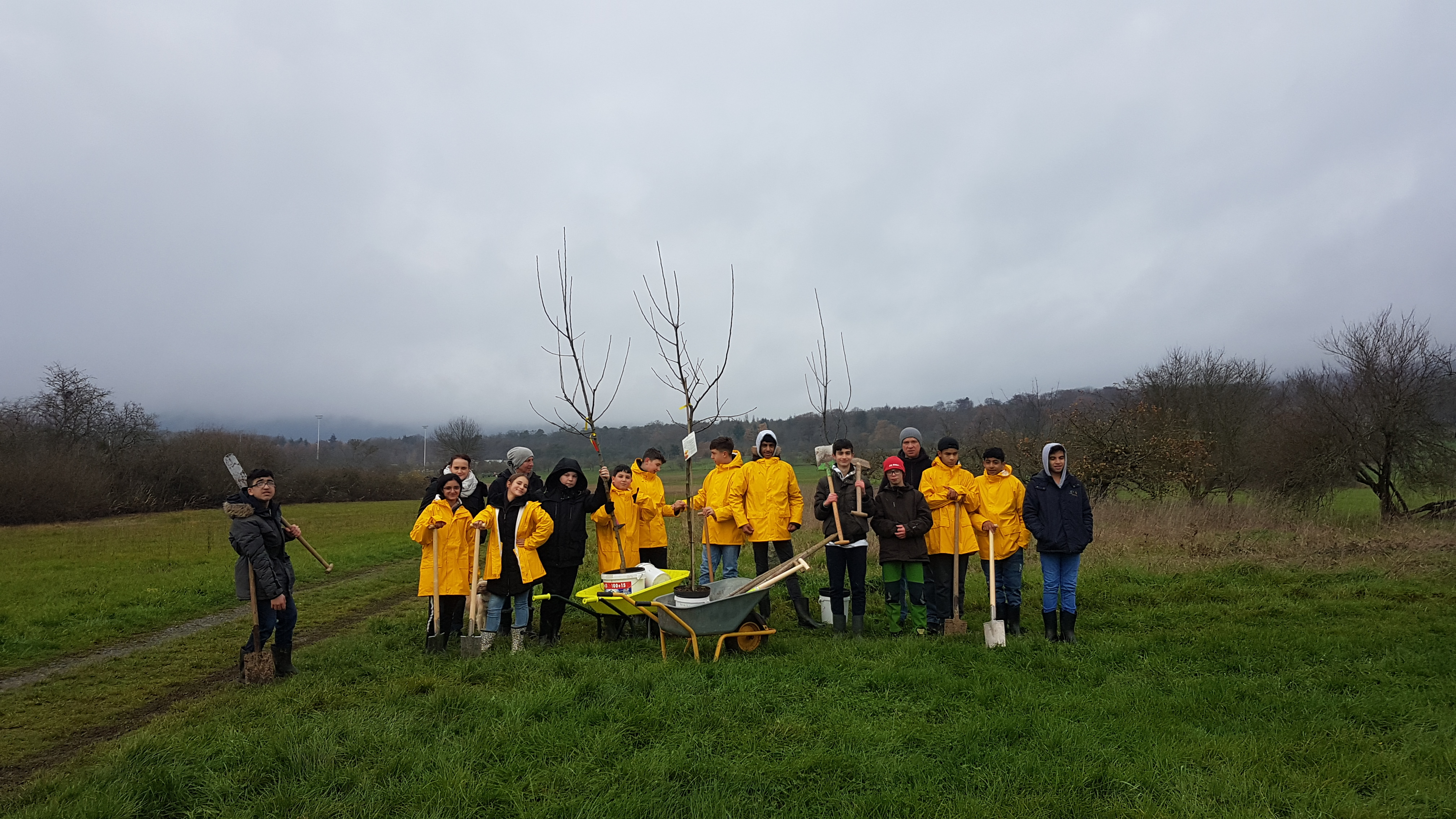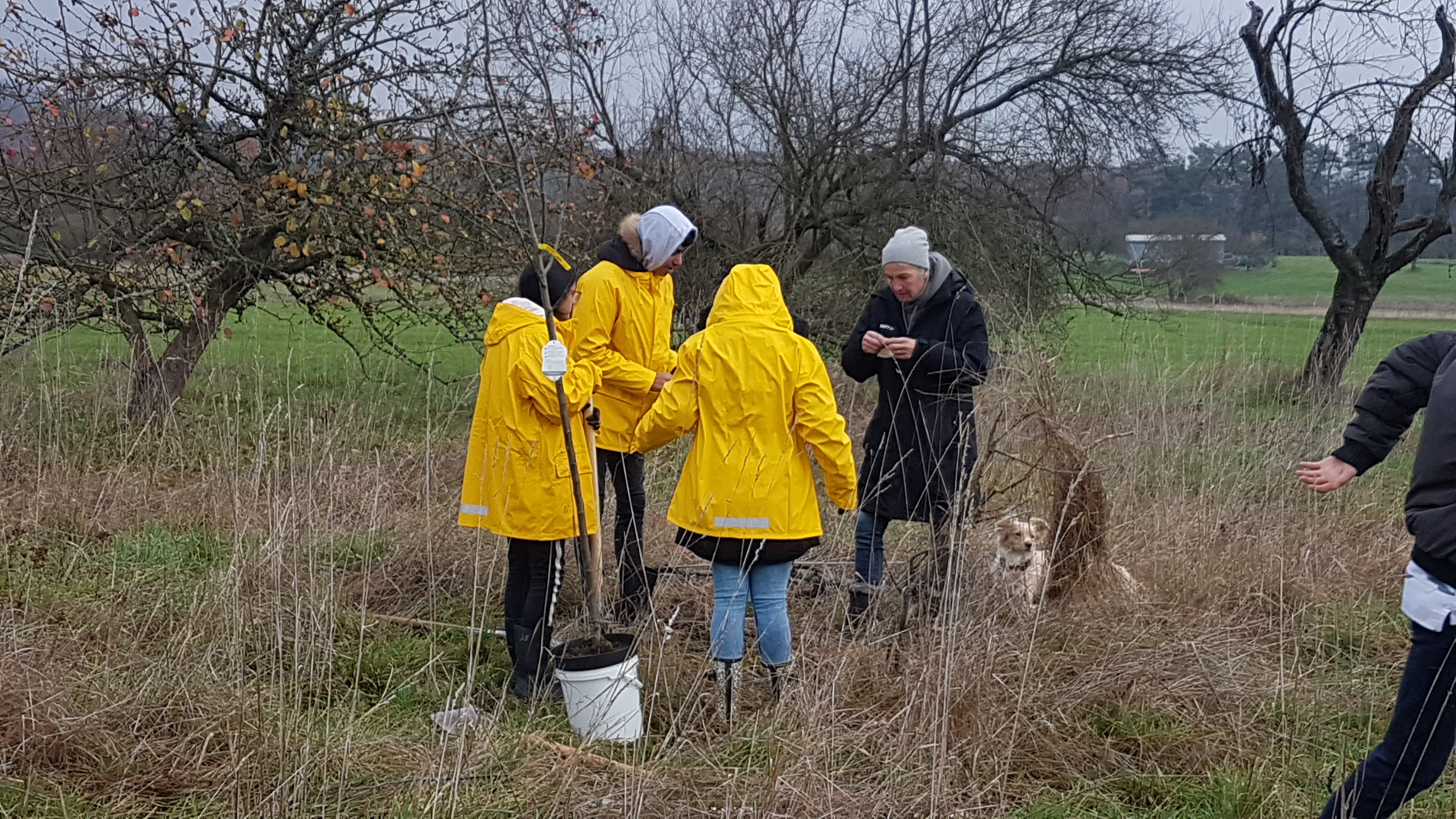 Am 08.12.22 pflanzte die 7C3 auf der Streuobstwiese drei Apfelbäume in den matschigen Boden. Sie haben sich viel Mühe gegeben, hart gearbeitet und sind ganz schön dreckig geworden. Mittendrin: Schulhündin Mina.