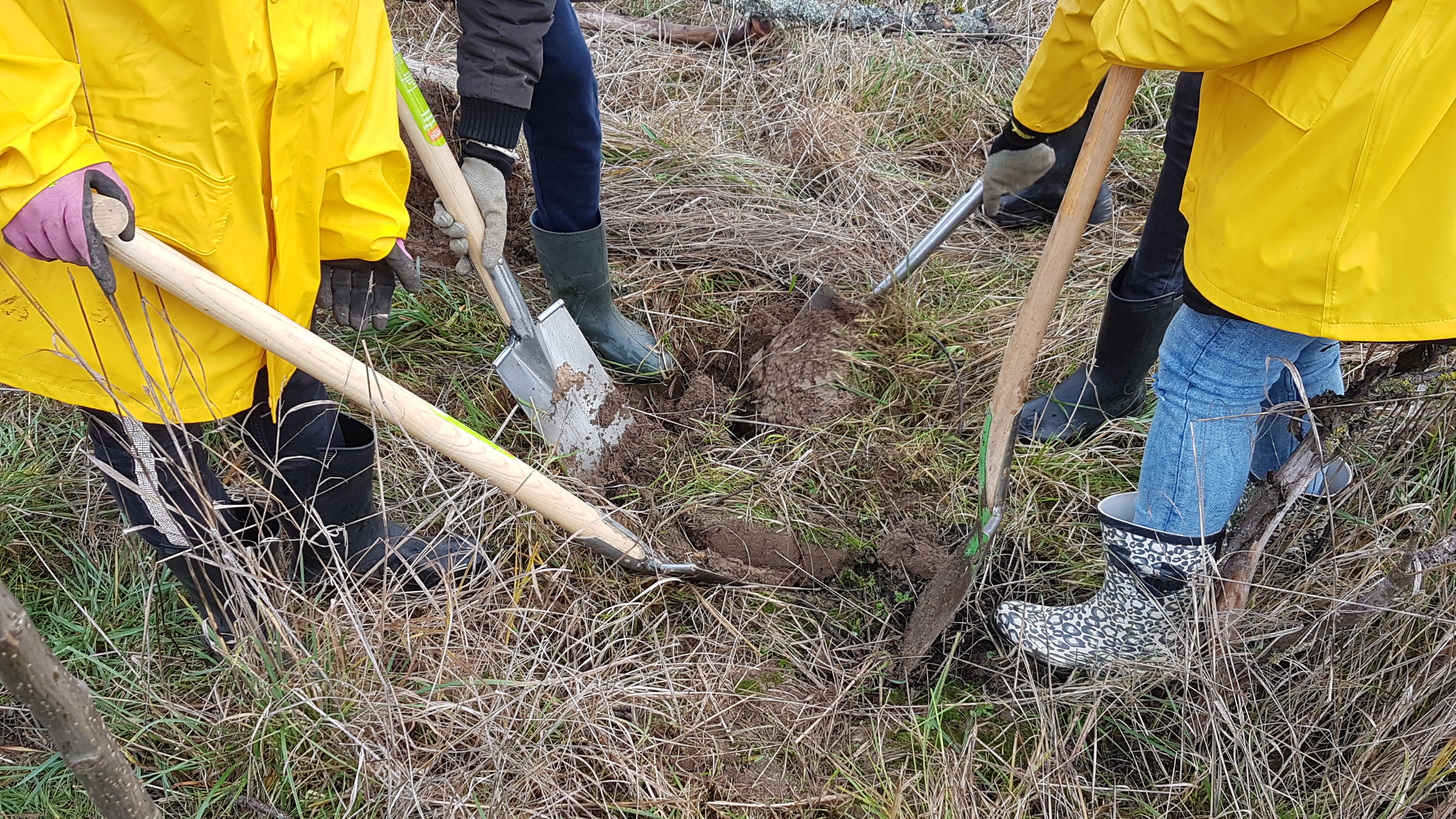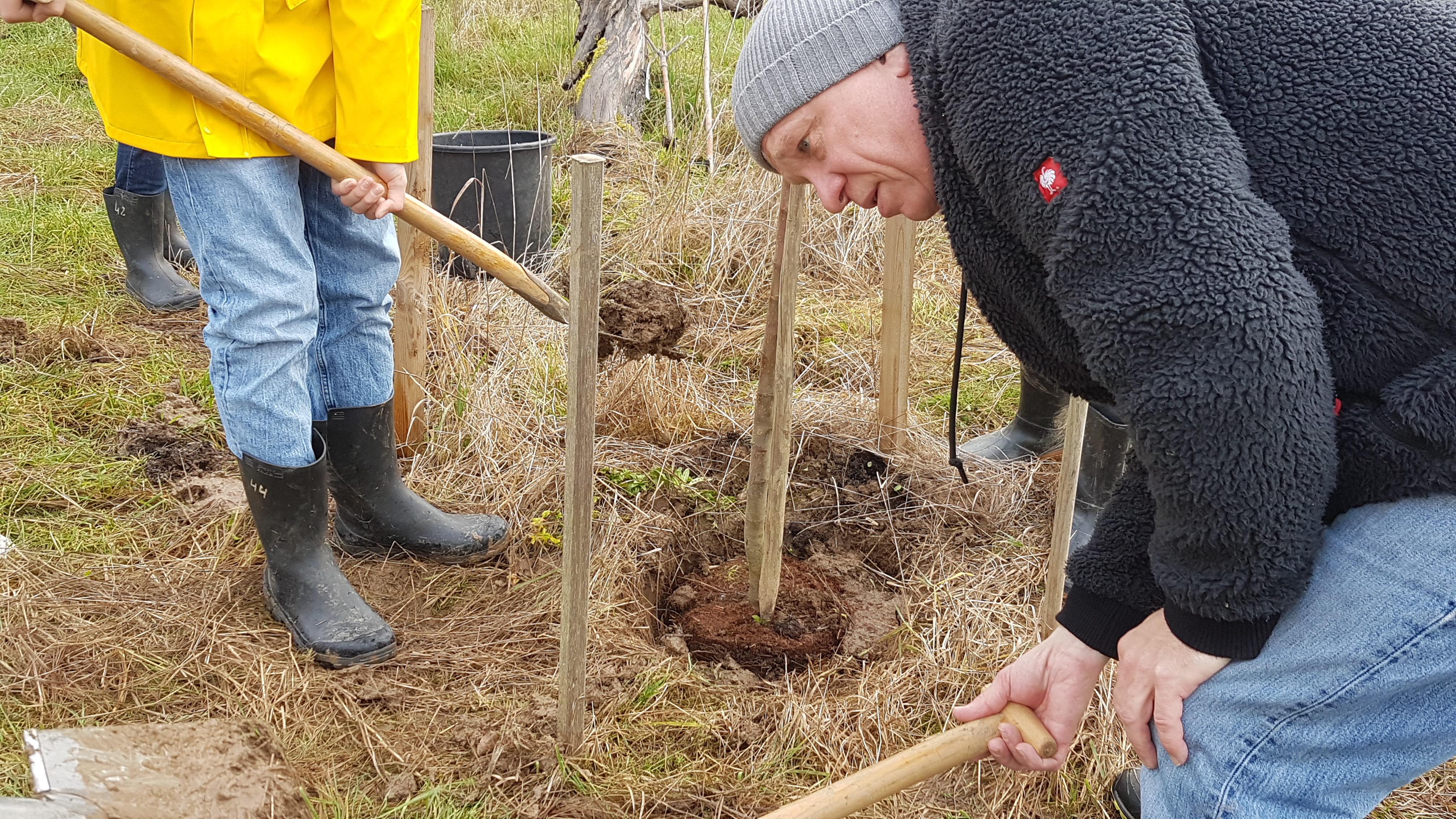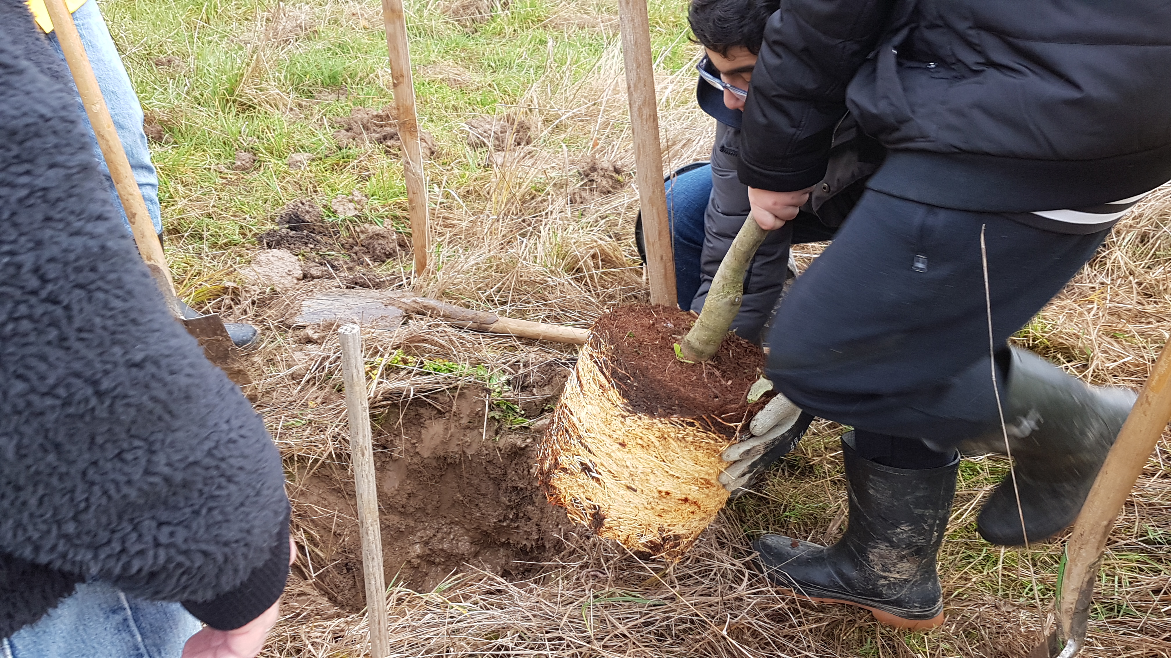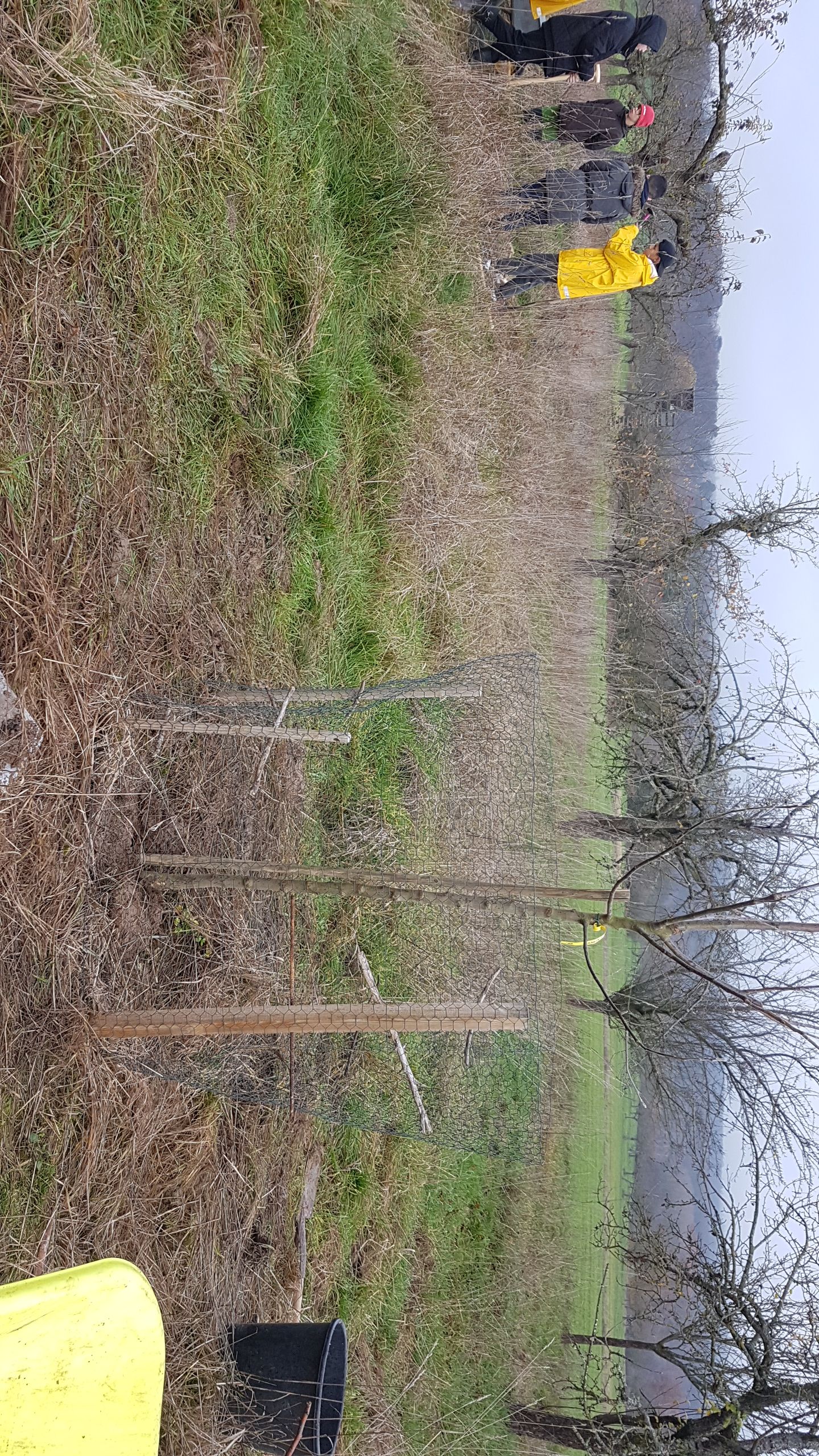 Am 08.12.22 pflanzte die 7C3 auf der Streuobstwiese drei Apfelbäume in den matschigen Boden. Sie haben sich viel Mühe gegeben, hart gearbeitet und sind ganz schön dreckig geworden. Mittendrin: Schulhündin Mina.