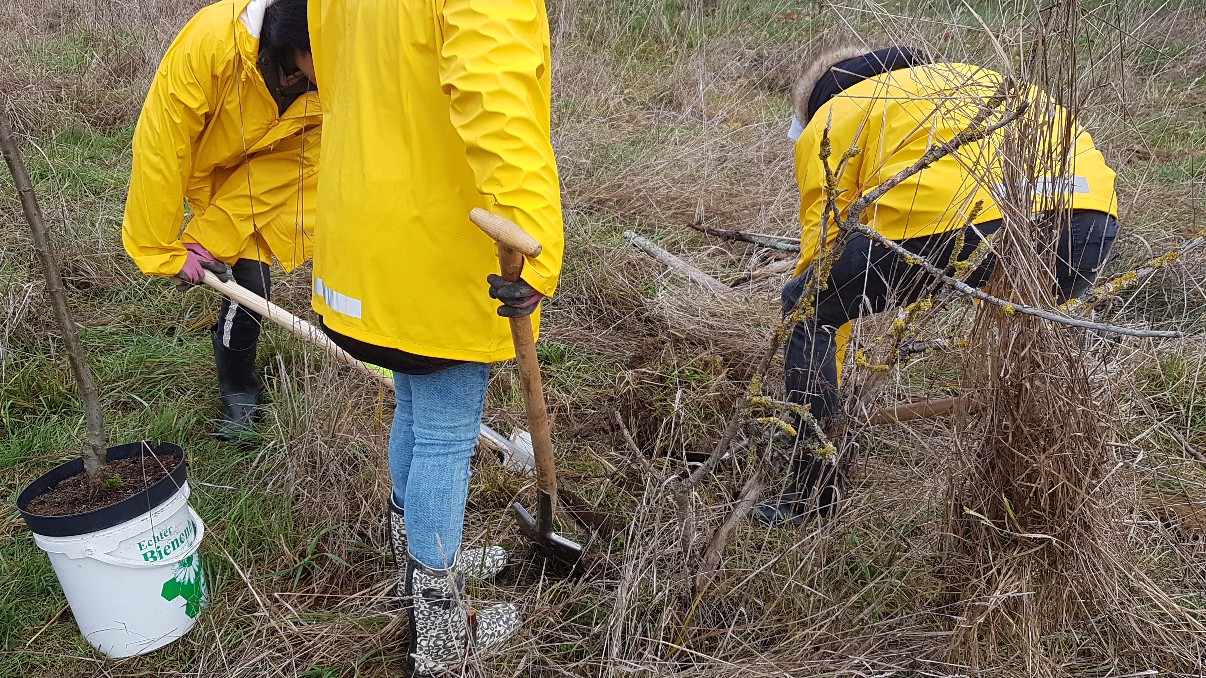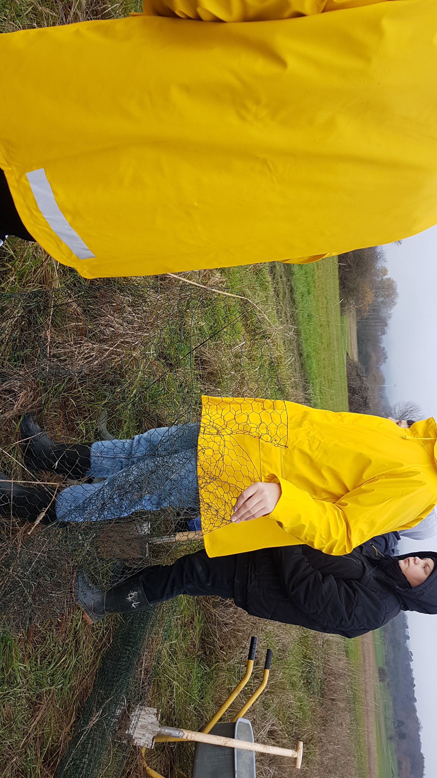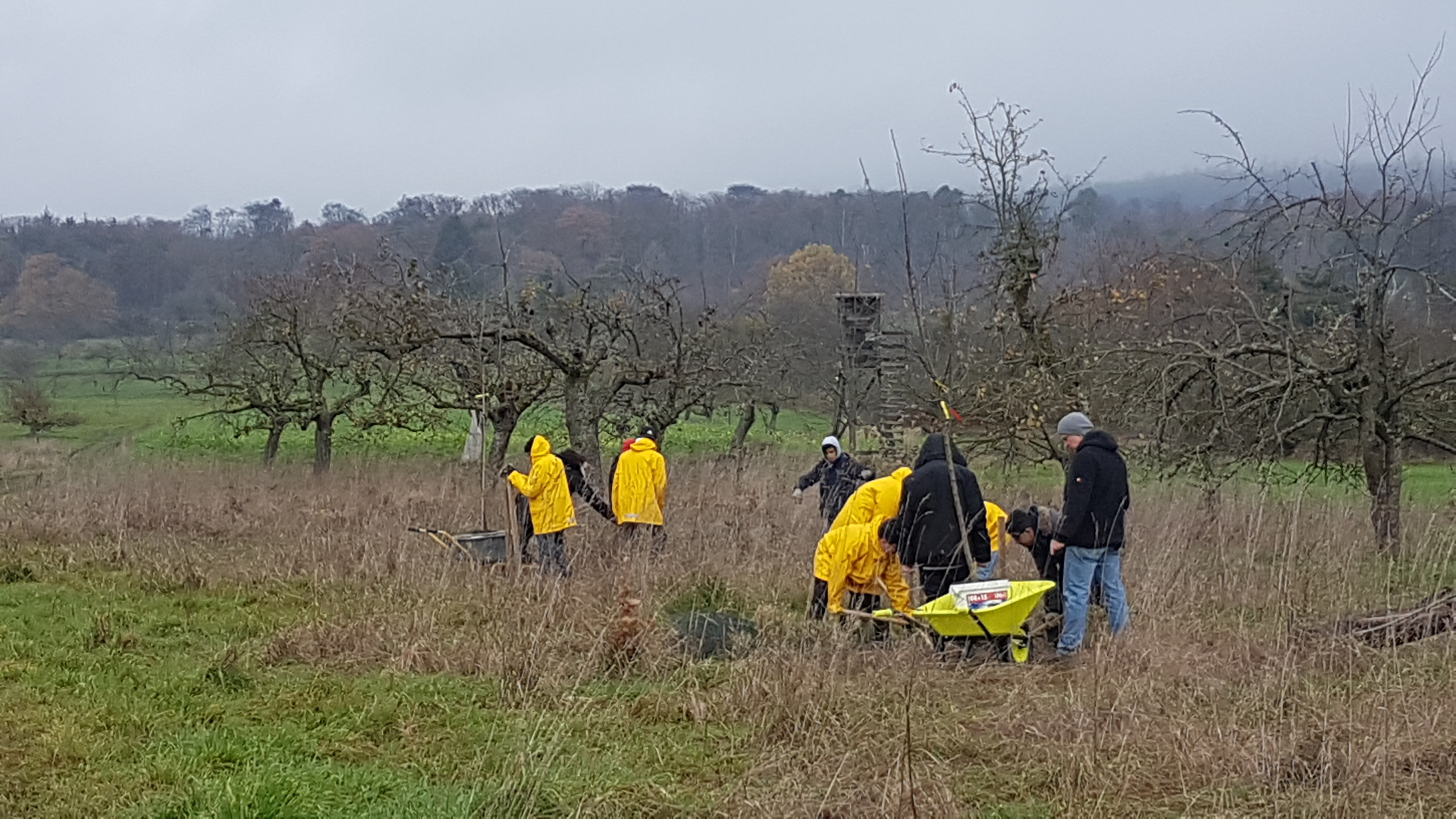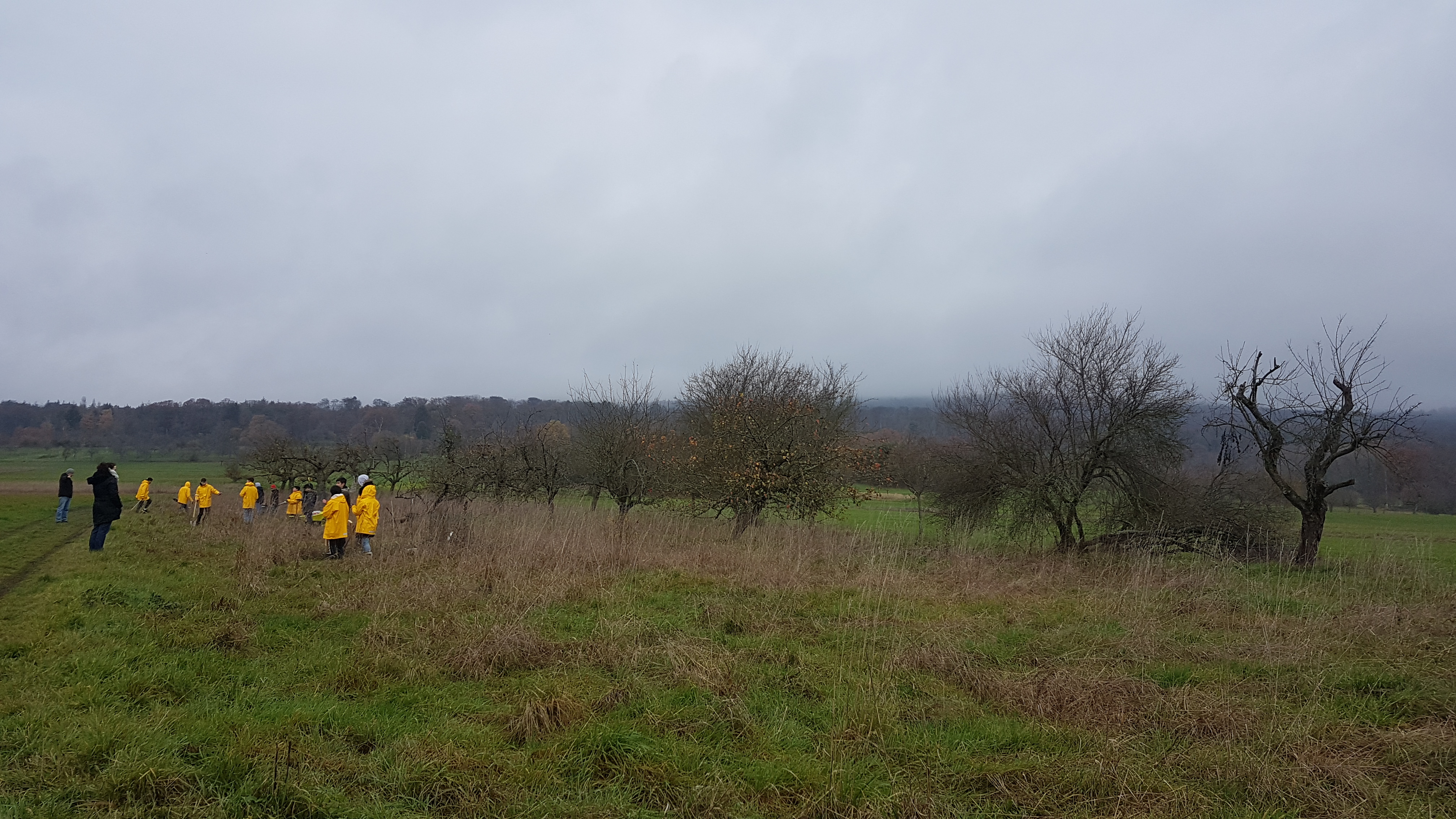 Es gibt was neues! Unsere Schule darf jetzt eine Streuobstwiese im Kirdorfer Feld besuchen und mitgestalten. Deshalb machten sich Herr Seel und seine Klasse mit Frau Kuntzsch von der Schulsozialarbeit auf den Weg. Mit dabei waren Gummistiefel, Regenjacken, Handschuhe, Spaten und drei Apfelbaumsetzlinge.