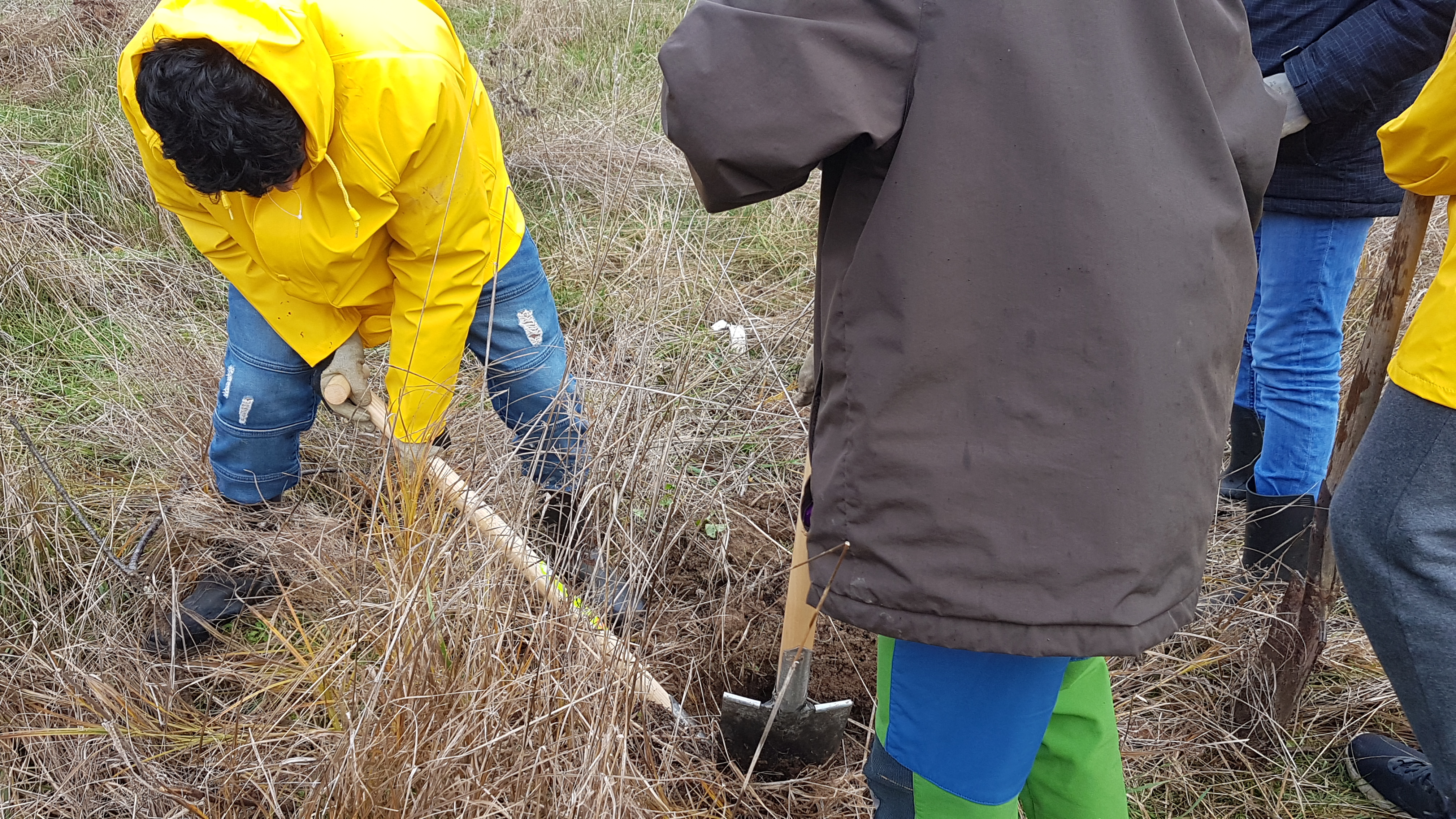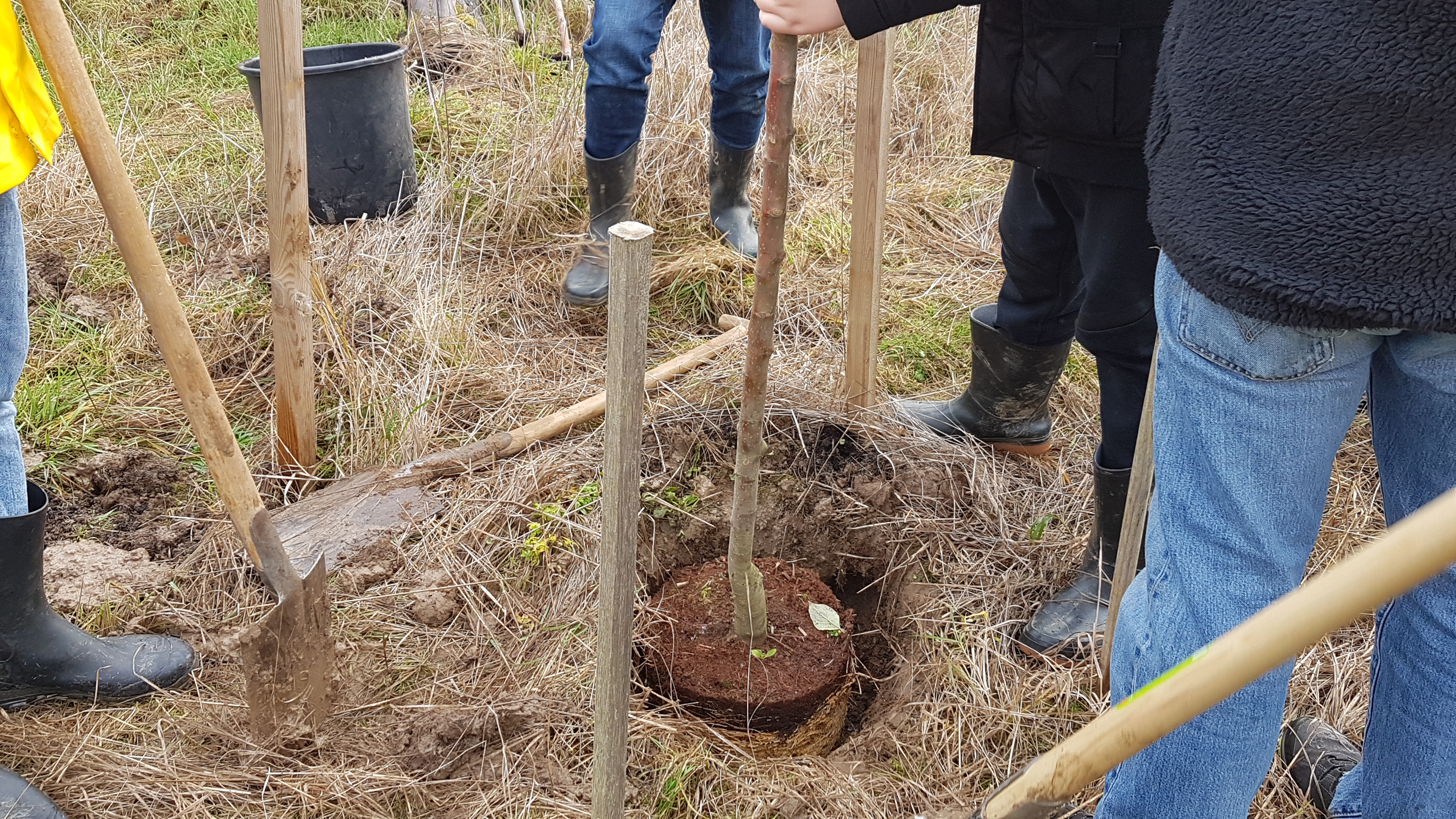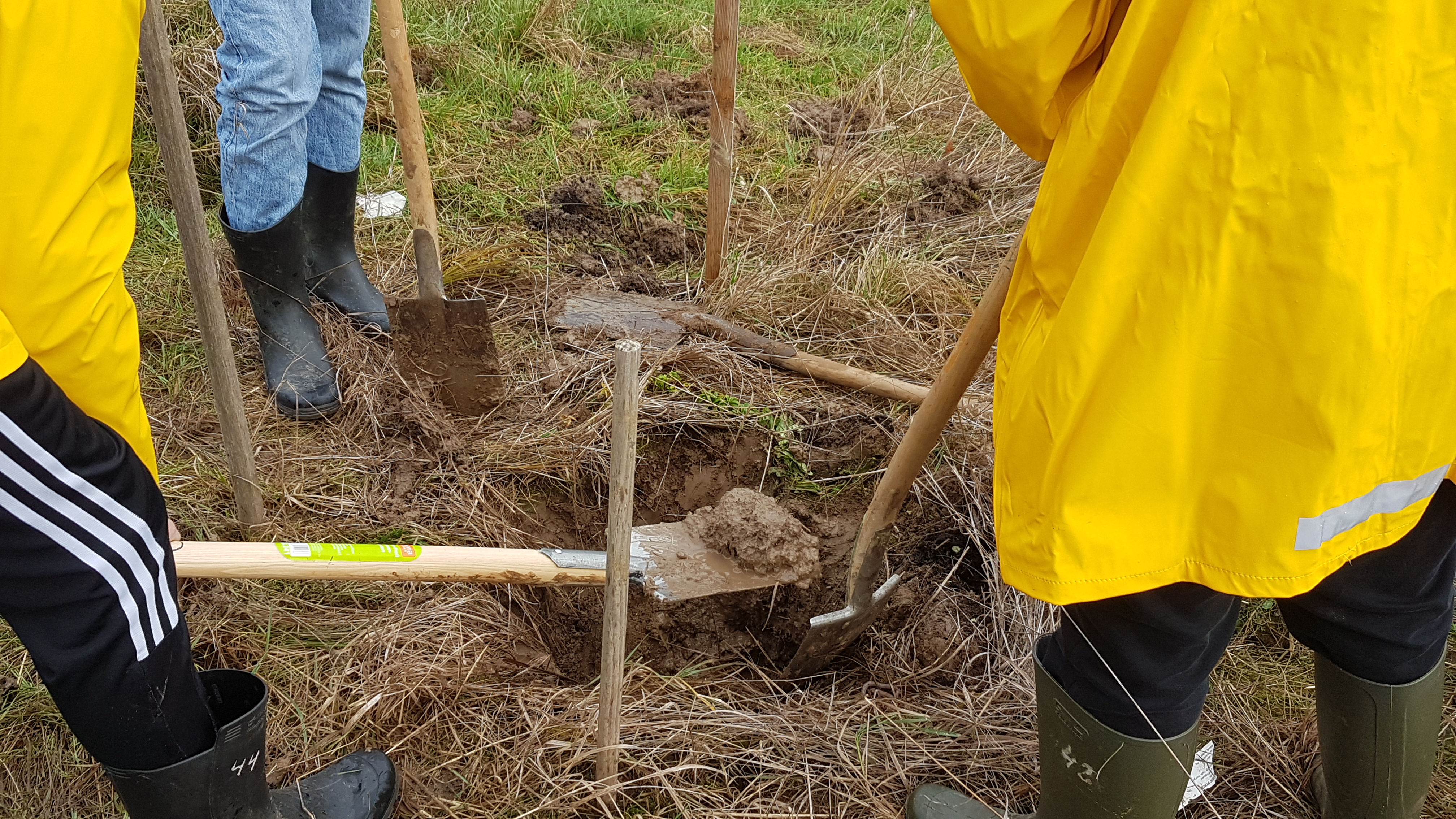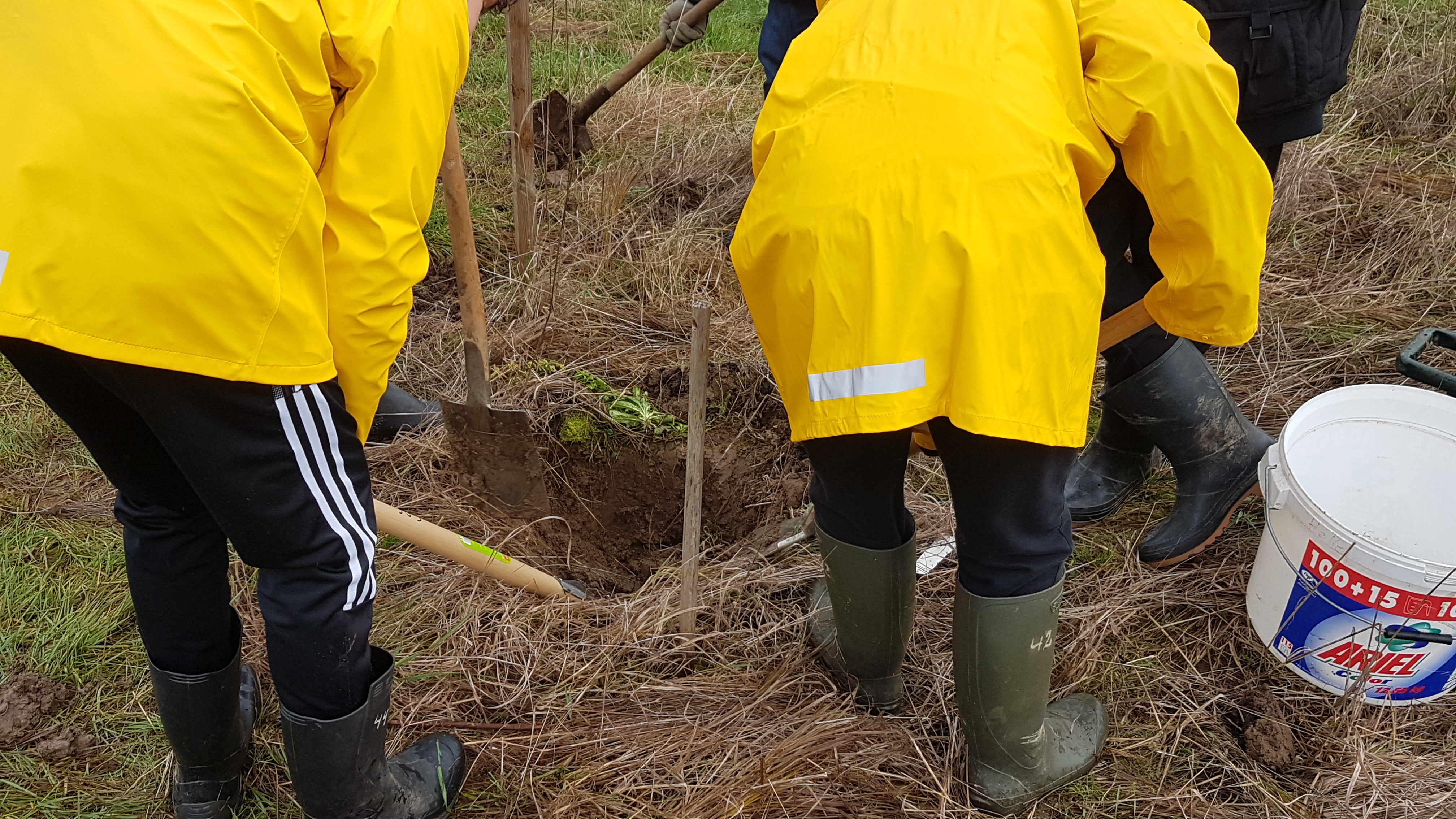 Es gibt was neues! Unsere Schule darf jetzt eine Streuobstwiese im Kirdorfer Feld besuchen und mitgestalten. Deshalb machten sich Herr Seel und seine Klasse mit Frau Kuntzsch von der Schulsozialarbeit auf den Weg. Mit dabei waren Gummistiefel, Regenjacken, Handschuhe, Spaten und drei Apfelbaumsetzlinge.